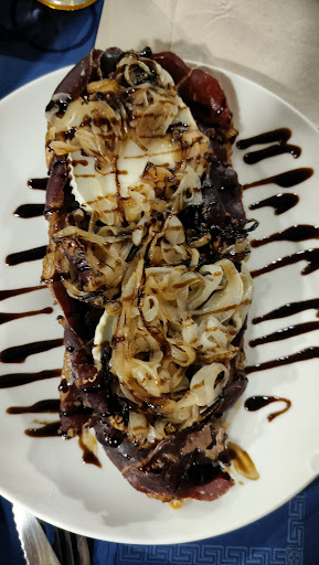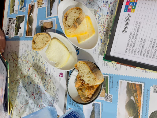 Nos sentamos en la mesa. Pedimos agua y nos ofrecieron tapa (la primera foto es de las tapas). Después pedimos una tosta de cecina, queso de cabra y cebolla caramelizada que estaba buenísima, bien contundente y con mucha cecina. También pedimos una pizza que estaba buenísima. Y por último, uno de nosotros pidió una hamburguesa que también dijo que estaba rica aunque tenía queso sin que lo pusiera en la carta (no es muy fan del queso pero nos lo comimos los demás).