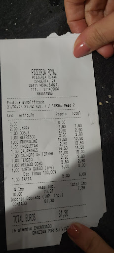 La comida muy buena, pero hemos tenido un problema por culpa del establecimiento con el precio y el dueño se ha puesto bastante agresivo, los trabajadores muy majos, le va a comprar las pizzas quién yo te diga. Viendo la respuesta explico el problema real: Llamamos al Royal para pedir la oferta de siempre la cual antes era de 16 euros cada 3 pizzas con la oferta 3x2, al hablar con el restaurante la chica que nos atendió nos dijo que eran 38€ y le dijimos que perfecto que pagaríamos con tarjeta, llegó el repartidor con nuestras 6 pizzas y en el ticket ponía 45€ les preguntamos que por qué eran 45 en vez de 38 y nos dijo que se habían equivocado, que nos dejaba las pizzas para que no se enfriasen y que le pagasemos cuando volviese, cuando volvió 45 minutos después vino diciendo que había habido una subida de precios y que eran 45€ pero a nosotros todos nos habían dicho 38€ sí nos hubiesen dicho 45€ no las habríamos pedido. Entonces el repartidor, muy amablemente nos dejó el número para llamar a los dueños. Nos contestaron y el propio dueño vino hacia la casa mientras seguíamos hablando por teléfono con la chica que nos había atendido y que estaba admitiendo su error. Cuando llegó el dueño, sin preguntar ni nada, nos dijo de malas maneras que no queríamos pagar y ya. Nosotros le intentamos explicar la situación, nosotros queríamos pagar lo que se nos había dicho porque si nos hubiesen dicho el precio al pedir las pizzas no habríamos pedido la oferta. El dueño siguió empeñado en que nadie nos había dicho que eran 38€ a pesar de que sus dos trabajadores lo estaban admitiendo delante de él. Siguió hablando de malas formas hasta el punto de llegar a pedirnos disculpas su propio empleado. Hasta que al final sin llegar el pobre hombre a entender nada y seguir creyendo que no queríamos pagar nos dijo que vale que pagasemos 38€ y que no volviésemos a pedir ahí, cosa que evidentemente no vamos a hacer, y después se fue mientras nos seguía gritando desde fuera de la casa. Así que venga contesta y di que está mal de todo ésto. Un abrazo y suerte...