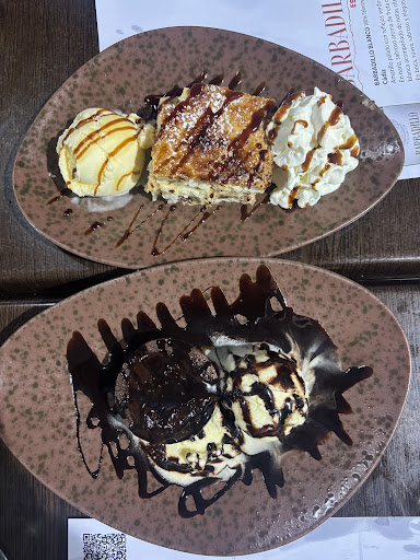 De postres mucho a elegir. Nos decidimos por: -Tarta de yema. Estupenda. -Tarta de hojaldre. Rellena de crema y nata. -Tarta de chocolate. Muy buena y suave. Todas las porciones acompañadas de nata con caramelo. Y había, además, helado de turrón, fruta, natillas y otros postresal que ya no recordamos. Un buen surtido.