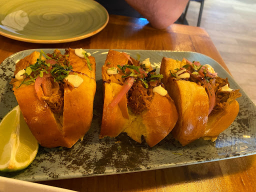 Estuvimos comiendo dos personas hace unos días. A pesar de no tener reserva para comer, conseguimos una mesa para los dos, aunque ya hemos estado varias veces y aconsejo reservar porque suele llenarse. Cuando te sientan a la mesa, te toman nota de la bebida y te traen un aperitivo, cosa de agradecer para hacer más amena la espera. En nuestro caso creo que era cazón o bienmesabe. El problema es que estaba frío, y eso lo desmerece un poco. Como entrantes pedimos los brioches de cochinita pibil y cebolla encurtida que he de reconocer que es mi plato preferido y estaban tan buenos como siempre. También pedimos las croquetas de rabo de toro. Aunque estaban recientes, no tenían mucha potencia de sabor. Además, no nos ofrecieron pan en ningún momento de la comida, no sé si es a demanda o que simplemente se les olvidó. Pedimos como plato para compartir Chipirones a La Parrilla Con Salteaddo De Manzana Y Cebolla Crujiente y tampoco nos entusiasmó demasiado. Para nuestro gusto falta algún tipo de salsa o algo parecido ya que estaban un poco secos, con la manzana y la cebolla frita por encima de los chipirones. Da la impresión de que faltaba algo para que estuviesen más jugosos. Por último, pedimos de postre el platano a la brasa con helado de vainilla, y tampoco nos gustó mucho. El plátano no estaba muy dulce, esperábamos algo un poco más caramelizado y la verdad es que nos gustan más otros postres que tienen en la carta. Por lo demás, el servicio bien, como en ocasiones anteriores y el ambiente también está correcto bajo nuestro punto de vista. Con las bebidas pagamos 52.40€, unos 26€ por persona. Repetiremos porque nos gusta el sitio, pero quitando los brioches, el resto de plato no...