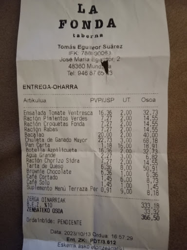 Cuando decidimos marcharnos, entro yo misma para pagar. Le digo a dos camareros que quiero abonar la cuenta, me preguntan de muy mala gana si tengo el ticket, les digo que no y les explico lo que hemos consumido y, tras unos segundos, me confirman que efectivamente tienen la comanda registrada. Pago y me marcho.
