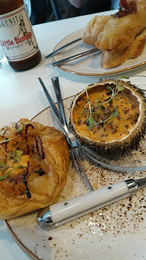 Fuimos un viernes y nada más ver la barra de pintxos, así como la carta de desayunos que tienen te daban ganas de elegir todo. Nosotros escogimos croissant a la plancha con mantequilla y mermelada y una tostada con mantequilla y mermelada. Respecto a los pintxos no pume me acuerdo de todos los que elegimos solo se que no me pude resistir a la gamba rebozada con panko en salsa de txangurro, el erizo, un hojaldre relleno no recuerdo de que, así como un pan brioche también relleno de no recuerdo bien,y pan bao de pollo con de una salsa muy rica y la tortilla de patatas y una pizza de pollo que tenían. Cuando nos ibamos nos comentó la camarera, por cierto muy majas y buen servicio te explican y te resuelven las dudas sin inconvenientes, desconozco si esto es solo los viernes o todos los días que a las 12h tenían paellas mixtas y allí que fuimos a por 4 raciones, en nuestro caso para llevar a casa y estaban riquisimas. Seguro que me dejo dejo algún pintxo pero...