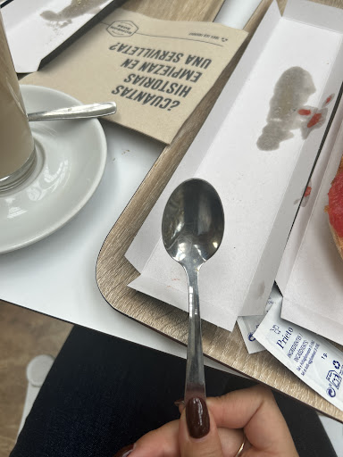 Read moreFuimos a desayunar, pedimos dos desayunos con croissant, mi sorpresa fue cuando cogí la bandeja para llevármela a la mesa vi que las cucharas estaban sucias, las tazas sucias con chorretes de café y no eran de mi café,y los croissant casi quemados por arriba. Estamos hablando de higiene, y de que vas a un sitio a desayunar y dios sabe cómo hacen los croissant, con que cuchillo lo abren y el jamón York y el queso en que situación y estado están , eso es lo que no vemos, porque lo que vemos como veréis en las fotos es repugnante. No volveré a ir y informaré a mi gente de confianza de lo sucedido para que no porten . Estamos hablando de salud, higiene y tener el estómago de servir las cosas...
