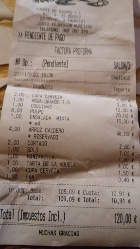 Read moreY porque no puedo poner menos estrellas. Por donde empezar.. un camarero mayor que aunque intentara ser simpático pero que su trabajo como camarero dejaba mucho que desear cuando piden lo que piden. Al preguntarle por el menú el camarero nos dice que no tienen, que nos lo dice oral, pero al preguntarte por precios nos dice que están como la media de aquí y allá. Un plato de pulpo de 28€ donde nos han servido 8 trozos sin aliñar y pasados. una ensalada minúscula, un cogollo y medio pequeño, cuatro pasas, medio tomate, cuatro arándanos, cuatro pepinillos y un poco de cebolla : 15€. Me ha parecido una vergüenza. Mi consejo, que si no van mejor, pero si vais hacer hincapié en los precios primero. Algo que decía el camarero es: 'esto eh Murcia' miren, yo no soy de Murcia pero mi opinión en esta ciudad...
