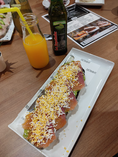 -LA CROSSFIT con tomate, atún, queso fundido, huevo rallado y salmón. Con masa integral.