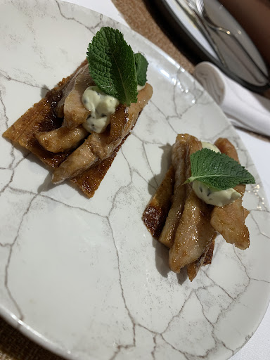 Comenzamos con huevas en dos texturas: adjunto reportaje gráfico: muy muy sorprendentes Y de ahí ni más ni menos que ostras de Cambados que degustamos en dos presentaciones: Natural y con Ponzu. Sublimes. Hay ostras y ostras: estas eran de la segundas Segimos con su tosta de atún de Almadraba: exquisito toro de atún en su punto justo de grasa, delicado y con mucha personalidad. El ravioli de cocido fue uno de mis pasos favoritos gracias a una majestuosa reducción, pero reconozco que yo "mato" por un ravioli, y acto seguidos pasamos a uno de los platos insignia de la casa: el chato pekín Desconocía que el chato es una raza porcina oriunda de la zona y de ahí su protagonismo en todo el restaurante. No soy partidaria en las reseñas de explayarme en detalles sobre un plato concreto para no restar parte del efecto sorpresa al futuro comensal, sólo voy a decir una cosa: ese crujir en la boca te vale en sí como justificación para toda la visita. Y vivo a 400 kilómetros...creedme: salvaje