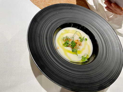 Ajoblanco con navaja gallega: creo que tienen que matizar este plato. A mí me sobró el sabor a frutos secos... pero ¡en la mesa hubo quién sugirió potenciar aún más los frutos secos! Desde luego tiene evolución.