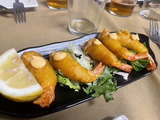 We ordered caballitos (beer-battered prawns), croquetas, verduras a la plancha (grilled veggies), huevos rotos (potatoes with jamón and egg), and entrecot to share. We also had some jars of beer for everyone.