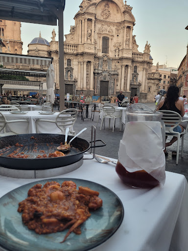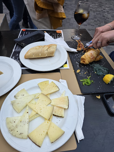 Lovely setting just outside the cathedral. My girlfriend ordered the fried squid, which was presented very well and tasted very nice. Unfortunately, that's where the good points end. I had ordered a cheese board, which was just a few thin slices of cheese chucked on a plate and €16. About half way through our starters, the main course was delivered. We both chose the burger de pollo (chicken burger) not expecting much anyway, we were very surprised to see a cheap old supermarket frozen chicken patty with some horrible cheese and a singular slice of lettuce in between a bun. We should've sent it back, but for some reason, we ate it. So we decided to end our dining experience there, paid the bill, and got dessert elsewhere. The waitresses were friendly and good. However, it felt like they were instructed to get us fed and gone. I would not recommend this place unless you want overpriced quick and...