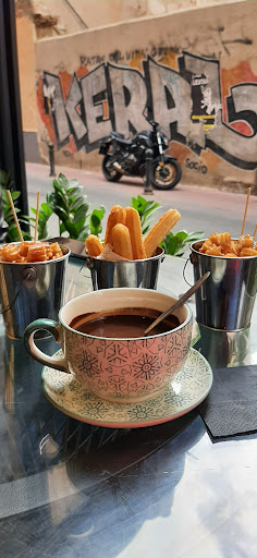 Read moreChurros, churros y más churro, así definiría yo este local. Posiblemente una de las mejores churrerías de Murcia respecto al sabor de sus productos y a su servicio. Los camareros son muy amables, muy rápidos con su servicio a sabiendas de su gran oferta y, sobre todo, muy murcianos, con un acento muy marcado. A pesar de que esta tienda tenía todas sus mesas ocupadas y eramos muchos los clientes haciendo cola por poder probar uno de sus churros, había mucha eficacia a la hora de trabajar ya que, rápidamente, cuando un comensal dejaba su mesa, el servicial camarero llegaba con los productos de limpieza para "asesinar" el posible Covid-19 y nos dejaba la mesa libre en menos de lo que canta un gallo. Y esto no es menos a la hora de atendernos porque ellos están siempre para ti y acuden con mucho brío. Por otro lado, hablando sobre la comida, he de decir que era tal y como me lo esperaba, chocolate puro servido en una taza muy espectacular, churros muy crujientes y sabrosos con un buen punto de azúcar, pero no eran grasientos, en comparación con los que solemos comprar en churrerías móviles (algo que valoro mucho como persona limpia e higiénica). Su carta tiene una gran variedad de productos, desde el típico tazón de chocolate como ya hemos hablado hasta churros salados con añadidos como el jamón serrano, patatas fritas y bacon frito, es decir, gustos para todos. Me gustaría remarcar un producto, que añado en mi foto, llamado Churro Bites: un cubilete lleno de trozos de churro con una salsa de caramelo o Nutella que, en mi opinión, se lleva la corona, no solo por su precio, sino por la cantidad de sustancia que lleva dentro que podría alimentar a una familia con problemas económicos. Como puntos negativos, aunque parezca que no pueda haber, encuentro dos. El primero de ellos tiene relación con su localización ya que está en una calle un poco escondida, a pesar de estar céntrica, que limita el espacio a usar y somos muy pocos los clientes que podemos disfrutar de un desayuno exquisito a la vez y, por otro lado, el segundo problema sería la desinformación de los camareros en relación con la cantidad de comida y me explico. Yo fui acompañado de un amigo y los dos teníamos un hambre irrefrenable de desayunar churros. Cuando llegamos al local hicimos nuestro pedido y la camarera no nos dio ninguna recomendación sobre la excesiva carga de churros que habíamos pedido por lo que, cuando estuvimos comiendo, nos dimos cuenta que las cantidades de esta tienda son tan contundentes y que no podíamos comernos toda la comida por lo que tuvimos que dejarlo, desaprovechando tanto dinero como alimento que a cualquier otra persona le podría ayudar. Aún así, se lleva mis 5 estrellas porque más vale que sobre, que...