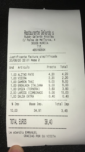 Si algo ha quedado claro en nuestra nueva visita de hoy es que Gelardo’s no parece ser de aquí sino de bastante más lejos. Si esperas encontrar matrimonios, marineras, zarangollo, tomates partidos con aceitunas, habas, michirones ... definitivamente este no es tu lugar. Gelardo’s es una propuesta gastronómica moderna y llena de sentido común en la que nada se hace al azar. La mano sabia de un verdadero chef en los fogones y un servicio de sala cualificado y orientado hacia la excelencia. Es precisamente en los pequeños detalles donde se ve el amor por lo que hacen y Gelardo’s, dentro de su falta de pretensiones, está lleno de ellos: tierno pan caliente, mantequilla atemperada previamente, servicio extra de sal de Maldon y de salsa sriracha siempre con dos cucharillas, cambio de vajilla y cubiertos entre platos, bonitas piezas de pizarra y porcelana blanca de diseño, copas de cristal de calidad. Una carta escueta pero llena de joyas gastronómicas fruto de la extraordinaria sensibilidad de su dueño y chef Rubén Gelardo. Un magnífico profesional -mejor dicho un cocinero/autor- formado en Italia y España con una mano y un ojo culinarios excelentes, tanto en presentación visual como en la combinación de sabores y el enorme respeto en el trato de la materia prima. Tiempos de cocción perfectos y maridajes casi perfectos. Comenzamos con unas gyozas de carne en su justo punto, llenas de sabor y con una salsa que las redondea y realza. Seguimos con una equilibrada ensalada de mozzarella de búfala con tomate kumato, cebolla frita y pesto a la que quizás le faltaba un punto de sal y un poco más de pesto. Continuamos con unas alitas de pato, un plato que debería ser un poco más trabajado para que queden más sazonadas, jugosas y que la salsa tenga más personalidad. Continuamos con unas mollas de vieira con jamón de pato y curry. Una maravilla que me arrancó las lágrimas. Perfectas en su ejecución. En su justo punto de cocinado. Jugosas, suculentas y llenas de matices aunque con un único pero: la salsa de remolacha, un poco subida de mayonesa y que mejoraría con un leve toque cítrico. Hablando de sal -condimento que deberían usar con mayor mesura- tanto el Magret de Pato con noodles y naranja como la Sardina Ahumada estaban ligeramente subidos. Para terminar, el remate perfecto. Los gambones thai con salsa de coco. Espléndidos, deliciosos y sin objeción posible. Mención especial una nueva incorporación a la carta: el calamar relleno de su tinta tierno, suave y exquisito, con un pesto de albahaca, aceite de oliva y anacardos difícil de igualar. Un plato superlativo. Da gusto ver la delicadeza y sabiduría con la que se maneja este joven chef. Puro talento. Con este derroche quién necesita estrellas Michelin. Felicidades. Y eso que aún nos quedamos sin probar el risotto de boletus -especialidad de la casa- , el pulpo con hummus y unos postres que visto lo visto apuntan a ser de escándalo. Para colmo, un buen menú diario y unos precios muy comedidos para la enorme calidad de lo que ofrecen. Roguemos para que cuando Rubén consiga llenar de nuevo este singular oasis gastronómico, todavía casi clandestino, logre mantener la misma frescura, calidad y amor por lo que hace. Afortunadamente, la pandemia no ha conseguido acabar con tu restaurante y aunque hayas reducido drásticamente la carta, eliminados algunos de los mejores platos, reducido tu stock de vinos y de materias primas podemos continuar disfrutando de tu enorme talento. Nos daremos un plazo mientras esperamos que tu normalidad se restablezca pero sabes que tarde o temprano volveremos....