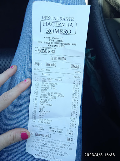 Celebramos la comunión de mi hijo el 13 de mayo de 2023. Pedimos un menú de 50€ el cual lo vendía la encargada Ana, cómo si fueran delicatesen con salsas exquisitas y un cóctel suficiente y abundante para esperar a la entrada al salón. El menú llevaba ibéricos, ensalada Hacienda Romero, calamares a la andaluza, carpaccio, pescado, sorbete, solomillo con frutos rojos y parmentier y tarta. Cuando llegamos el cóctel eran dos mesas con 3 platos de patatas fritas y olivas y 3 platos de miniempanadillas congeladas ya frías. En las mesas botellas de 2 litros de refrescos y alguna jarra de cerveza. Casi no habían copas para poder servirte bebida y claramente cuando llegamos no probamos nada porque no iban los camareros con platos para repetir. Todo muy escaso y pobre. Al entrar al salón nos van poniendo la comida. Trajeron unos calamares ridículos y muy poco apetecibles. Ni en el peor chiringuito de playa he probado yo unos calamares así. La ensalada la describen como algo especial (lleva el nombre del restaurante) y nada de diferente tiene de una bolsa de ensalada de Mercadona con tomate y dos líneas de Salmón con vinagreta. Nos dios vergüenza poner ese menú para nuestra familia. Llega el pescado y estaba bueno pero nada de especial. Al llegar el sorbete, con su pajita es imposible de beberlo porque sale congelado y tenemos que tomarlo con cuchara. La metre, muy adiestrada, se da cuenta de mi cara y viene con un sorbete en condiciones solo para mí, cosa que aún me enfado más porque quiero la misma calidad para mí que para mis invitados. Llegamos a la carne y emplatan dos trozos de solomillo con dos pegotes de algo que se supone eran los frutos rojos y el parmentier con salsa que hace un año nos vendió como exquisito. Durante toda la comida tuvimos que estar reclamando al camarero bebida porque nos faltaban muchísimas cosas y éramos tan sólo 39 adultos para comer. Llegamos a la ansiada tarta y mi hijo se pone a cortarla cuando el pobre no puede. Hace fuerza y nada, hasta que me doy cuenta de que la tarta de queso está a medio descongelar y de la mitad para abajo y está dura. Cuando la sirven, porciones de dos dedos por persona, sigue congelada por supuesto. Se lo digo a la encargada Ana y me dice que es una tarta compacta, la chica no hay que negar que tiene salidas. Una tarta de queso que no es nada especial, si lo hubiera sabido la hubiera encargado en alguna confitería porque no es de dos pisos ni nada diferente, una de Mercadona grande de niños de trufa no le tiene nada que envidiar ni en sabor ni en tamaño y menos en presentación. Toda la comida estuvimos escuchando la música de las demás comuniones ya que es un salón grande dividido por biombos. Cuando una comunión pone una música tu comes con esa música, si hay video, también, así que habíamos 7 comuniones y al final desde que entramos la comida fue como si estuviéramos en una discoteca comiendo. Unido al murmullo de las personas y niños de 7 comuniones que al llover y unido a que las monitoras no estuvieron muy pendientes de los niños, se quedaron en los salones jugando entre ellos y correteando. No disfrutamos el día porque estábamos más pendiente de que todo saliera bien en el restaurante que de vivir el momento con nuestro hijo. Desde luego que no recomiendo hacer una celebración si quieres calidad y buen servicio ya que considero que abarcan más de lo que realmente pueden y descuidan los detalles y el servicio. La encargada debería leer estas palabras de forma constructiva. Cuando vas un año antes de la fecha para reservar quieres que ese día salga todo bien, sea especial y Ana te lo vende todo fenomenal. Pero te sientes engañado cuando llega el día y lo que te ofreció con buenas palabras y salsas exquisitas compruebas que es comida mediocre y con falta de detalles y calidad. Nos dio vergüenza invitar a nuestra familia en un día tan especial en ese...