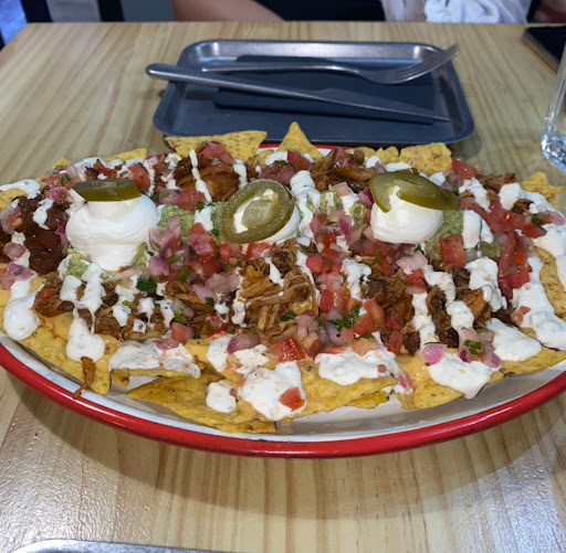 ~Nachos: 8/10. Aunque el nivel de los nachos es mucho mejor que la calificación que les doy, tengo que bajarle puntos debido al exceso de picante, lo que nos impidió terminar el plato. La mayonesa de jalapeño fue lo que más picaba. Puede que haya sido nuestra culpa, ya que los ingredientes estaban indicados en la carta, pero no imaginamos que picarían tanto. Creo que, si un plato es tan picante, debería especificarse mejor en la carta o el camarero debería advertirnos. Aun así, el sabor de los nachos nos gustó mucho, especialmente el pulled pork, que para mí fue lo mejor. Eso sí, los totopos no eran caseros, sino de bolsa, y eso se nota. La próxima vez pediremos las salsas picantes aparte para evitar el mismo problema. En general, son unos nachos bastante buenos.