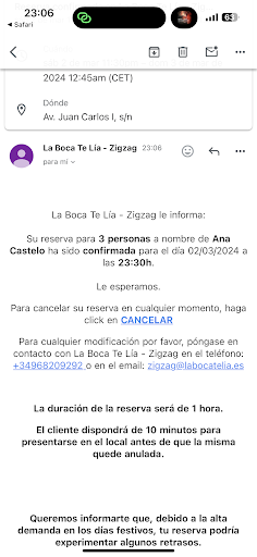 ¿Respeto de qué? Si tú no tienes ninguno Casi que me voy hasta sin pagar Resumen, hemos cenado con prisas, sin ganas, escuchando salvajadas y con muy mal sabor de boca Es una pena que se ponga a gente así al servicio de un restaurante, ¡vais a perder mucho! Adjunto mi reserva que era a las 23:30...