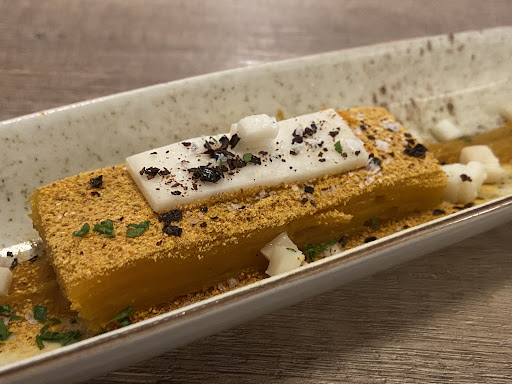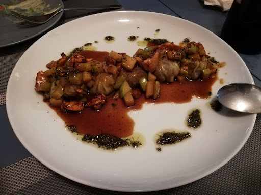 Local muy, muy pequeño, por lo que reservar es altamente complicado. Fuimos con un menú cerrado, el de 28, aunque si los comensales son menos de 8, se puede ir a la carta. Siete servicios más dos postres. Empezamos con los raviolis de nabo con tartar con atún, unas sardinillas en tempura y unos mini bocadillos de pan chino con panceta. El plato que menos nos convenció fue el cuarto, el bol camboyano de pollo, mango y zanahoria, muchísimas zanahoria. Los tallarines de sepia con setas y el salmonete con soplete al ajo blanco nos encantaron, pero fue el último plato, los raviolis de rabo de toro con setas y manzana el plato que más nos gustó. Como habíamos advertido que nos acompañaría un alérgico al marisco, en lugar de la sepia habían preparado un pulpo con picada tailandesa. Menos mal que no pudo venir. El pobre alérgico se hubiera muerto igualmente al comer el pulpo, pero la intención fue buena y el plato, que nos comimos los que sí habíamos ido, estaba delicioso. Un pulpo diferente. Esto lo regamos con vino de la tierra. Un Pino Doncel black. No había mucha más opción. Con los dos postres, una tarta de queso invertida y servida en vasito, y una creme brulée terminamos. Un servicio muy atento en un entorno muy familiar. Y ante la dificultad de reservar una noche de fin de semana, ya hemos reservado para nuestra próxima visita, que espero que sea tan...
