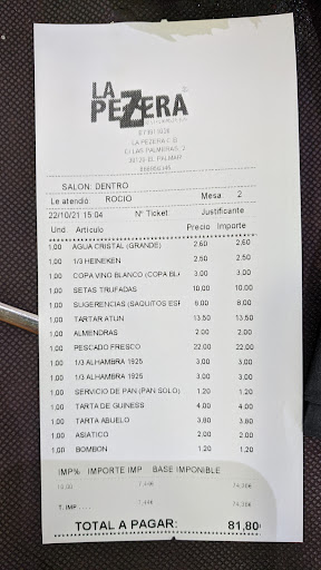 Read moreSobre 10: servicio de 12, precio de 8, decoración y limpieza del establecimiento de 10, calidad de la comida de 6 y emplatado de 9. Adjunto foto de algunos platos y la cuenta. La atención y profesionalidad del personal es sin duda lo mejor y por lo que merece la pena pagar el precio, que si no fuera así me parecería un poco caro. 3 personas pedimos: Almendras: sabrosas y con un punto genial de fritura, grata sorpresa. Tartar de atún: excesivamente salado y aceitoso, una pena porque pintaba genial. Saquitos de espinacas: bonito e insípido. Setas trufadas: el huevo muy muy bueno, las setas bien pero de bote y apenas calentadas, piñones de adorno porque sabor ninguno. En resumen, sabores sin integrar con un exceso de aceite importante. Bacalao recomendado por la estupenda camarera Rocío: rebozado es-pec-ta-cu-lar, pescado jugoso y rico, presentación divina, las verduras salteadas muy ricas pero una vez más con un exceso de aceite importante. Tarta de Guiness: TREMENDA! Si eres de sabores naturales, con azúcar en su justa medida, no puedes irte sin probarla. Tarta del abuelo: muy muy rica. Asiático: aprobado justito. Ojalá reviséis el tema...
