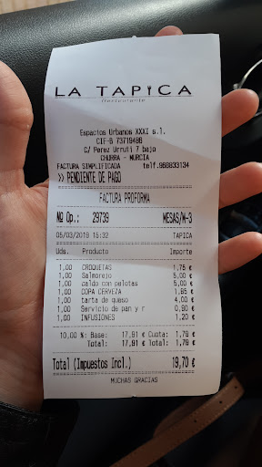 Read moreLo cortés no quita lo valiente así que, espero que esta reseña sea un aviso a navegantes y clientes que vayan de nuevas a La Tapica, para que no paguen (muy cara) la novatada como nos ha pasado a nosotros. Nada que reprochar a la calidad de la comida, entrantes, plato y postres que hemos disfrutado realmente, ni al trato del personal (Francisco, el dueño, encantador y educado). Pero... Consejo y cuando digo consejo, es CONSEJO con mayúsculas: si vais de primeras, pedid la carta nada más tomar asiento, ya que si no tomáis este camino la sorpresa final con la cuenta puede ser no todo lo agradable que esperáis. ¿Por qué pasa esto? Porque en nuestro caso, el dueño, muy simpático, cordial y un punto zalamero (no lo critico, es un profesional, es su trabajo y lo hace muy bien) te va ofreciendo ideas y si te dejas llevar y le haces caso y reitero, no tienes la carta a tu disposición y actúas de buena fe, pues pasa lo que pasa ¿Es justo el precio que hemos pagado? A mi entender y eso ya es una opinión, algo excesivo, pero repito, culpa nuestra por no pedir la carta y espero que el personal de La Tapica no se tome esta reseña como una crítica negativa sino como un aviso a futuros clientes de no confiarse de entrada en la...