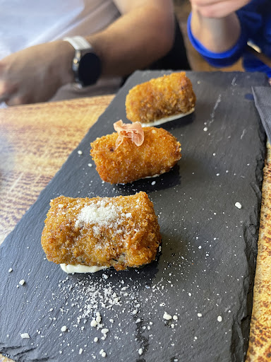 Ya había oído hablar muuyyy bien como restaurante. Había desayunado en alguna ocasión y muy bien. Pero hoy voy a contar nuestra experiencia a la hora de comer. Hemis ido los 5. Hemos empezado con unos entrantes. 1 croqueta de vaca vieja y otra de jamón. Mis hijos decían que era la mejor que habían probado. Un canalón de pato, unas bravas 2.0 y unas alitas. Delicioso. Y unas hamburguesas, la yanki, jugosa, enorme. Una trufado con n huevo poché. Una murciana, con chato.... Un bocata Olivia con un pan buenísimo. Y un bocata Tejera King. Mis hijos lo han devorado todo. Y llegamos a los postres. Tartas de el abuelo, zanahoria, browni y queso al horno. Cerramos con 2 cortaos. La atención excelente. Ambiente para toda la familia. Un pequeño escalón en la puerta, pienso que con un poco de ayuda puede acceder una silla de ruedas porque la puerta es amplia. Coste total, 107€. Hemos descubierto un nuevo restaurante para comer en familia donde la relación calidad-precio están genial. Muy recomendable