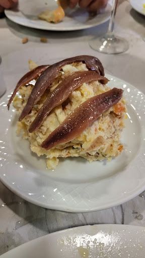 Fuimos este sábado a comer, llamando con tan solo una hora poco menos de antelación porque el plan surgió de repente y no hubo problema incluso aunque eramos 7 a comer (cuando lleguemos no estaba para nada vacio, de hecho si habia algo de ruido de más). El servicio fue a buen tiempo, y de la comida ninguna pega estaba todo muy bueno, lo que pedimos fue: Una ensaladillica al centro con anchoas, dos raciones de calamares a la andaluza, otras dos de mejillones (salieron gordos y súper buenos), una ensalada también para todos y no escatimaron, y ya por último carne que incluía cerdo y cordero con patatas a lo pobre que también estupendo. Respecto a los postres y café: 2 de tarta de queso (buenas pero empachan!) 3 de pan de calatraba (igual que la tartica de queso) unas natillas y una tarta de la abuela (es contundente también) pero 👌🏻. Salimos con todo y bebida (a destacar el vino tinto que...