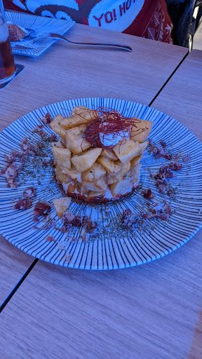 Hablando de la carta de platos, la carta se compone de platos para compartir y después tiene una serie de montaditos y hamburguesas, El mejor plato de todos y que puede envidiar a muchos bares y restaurantes de España son sus patatas bravas. Patatas bravas perfectas, hasta la presentación. Plato 100% recomendado. Las croquetas estuvieron buenas. Los nachos estaban muy buenos, son diferentes a los que se suele servir ya que el toque de la salsa barbacoa los hacen únicos. Como plato principal probamos las hamburguesas. No me pidieron el punto de la carne, eso es algo que no me gusto. Otro detalle que en la carta la hamburguesa Nukka no pone nada de lechuga y me sorprendió que si llevaba lechuga. La hamburguesa estaba buena ya que la carne la pusieron al punto y estaba buena la carne. El pan de la hamburguesa también bueno.