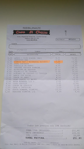 Para más inri, pedimos unos tomates Raf (según la carta) y cuando los vimos insistimos en preguntar si eran Raf y que se tratara de buenos tomates (ya que por el precio que tienen, como verán en la imagen adjunta, es lo mínimo exigible), pues bien, nos trajeron una cosa insípida y arenosa que no tenía nada que ver con un tomate en condiciones: 5 trozos mal puestos que salían a 1€ y pico el pedazo. Cuando les hicimos saber que esos tomates no eran ni Raf, ni Muchamiel ni nada parecido nos trajeron otros de aspecto muy diferente y mucho más sabrosos. Nos preguntaron que qué nos parecían ahora, y les dijimos que no tenían nada que ver con los anteriores.