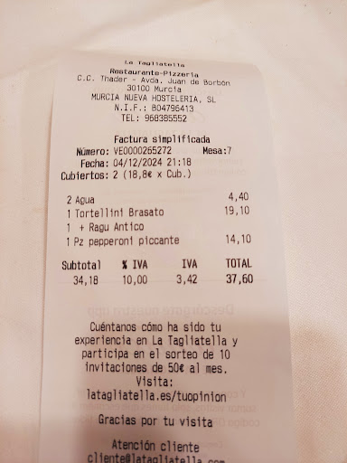 Read moreLa Tagliatella es todo un clásico y pese a ser una franquicia mantiene un nivel de calidad que muchos otros supuestos ristorantes ni sueñan. En concreto esta es una de las mejores opciones aquí en Murcia ya que suele estar bastante tranquila, tienes parking asegurado al estar en el Thader, mesa a la hora que quieras sin necesidad de reservar y un excelente servicio. La chica que nos atendió era nueva pero supo desenvolverse con facilidad pese a no saber qué plato le estábamos pidiendo, fue muy agradable y eficiente. Seamos sinceros, no es especialmente barato pero al final pagas lo que comes ya que está todo súper sabroso. La masa de las pizzas está tan crujiente que no importa si te parece que es demasiado fina o no. Los tortellini con ragú muy recomendados, con abudante salsa y una mezcla de sabores exquisita, aunque bueno, como todo. Nos sobró comida y nos pusieron una bolsa muy mona para llevárnosla. Esta Tagliatella siempre es una opción asegurada si quieres pasar una velada apacible disfrutando de una gastronomía italiana riquísima sin que te...