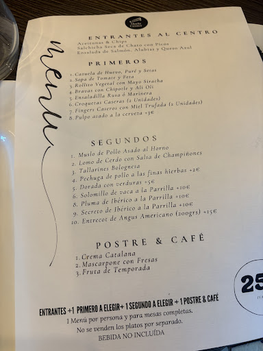 Read moreVERGONZOSO. NO LO RECOMIENDO. Cuando entras te da la impresión de un buen restaurante, ya que es muy bonito y elegante. Fuimos 6 personas a menú de 25 euros + bebidas aparte. Si quieres determinados platos son 10 euros más( hasta ahí bien). Los entrantes para 6 son dos platitos de patatas fritas con olivas y una bandejita de salchicha seca con almendras. Tras 15 minutos de espera nos toman los primeros platos (jiji) por decir algo , una marinera, unas patatas bravas, dos trozos de pulpo etc de risa, ya que no son platos son tapas. A la media hora de comernos los primeros platos, me levanto y les llamo la atención pues ni siquiera nos habían tomado nota de los segundos, nos toman nota y 45 minutos después (ya desesperados) me vuelvo a quejar y tras 10 minutos más nos sirven los segundos . Postres prefabricados de tarrina. NO LO RECOMIENDO, NO VOLVERÉ JAMÁS. Una pena porque el restaurante es muy bonito pero la comida es escasa y el servicio pésimo. Dejo menú y cuenta...