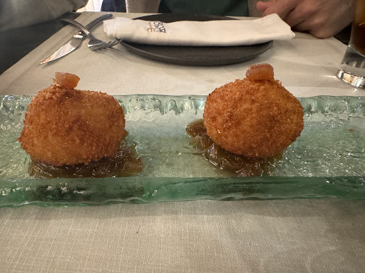 Pedimos una croqueta de cada tipo. El sabor de la croqueta de michirones bastante conseguido, la de queso no era nada nuevo. El rebozado era bueno pero las croquetas muy densas y la bechamel muy poco fluida.