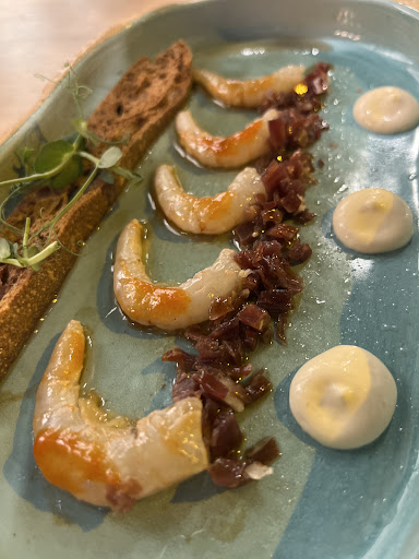 Para cenar nosotros pedimos: -"Casi carpaccio" de gambitas blancas, ajo asado, jamón ibérico y sriracha 🍤 (15€) : espectacular. Además el plato llevaba picante y no tuvieron problema de poner las gambas picantes en un plato, y las sin picante en otro. -Croqueta de gambas al ajillo con alioli de limón (2.20) unidad): estaban muy buenas. Sabor y textura correcta. -Croqueta de queso de cabra, nueces y cebolla dulce(2.20/unidad): estaba también correcta, aunque nos gustó más la de gambas al ajillo. -Portobello marinado en aceite de trufa negra, apio,parmesano y piñones 🍄(12.50€) : correcto pero una ración demasiado grande, lo cual hace que no puedas pedir y probar todos los sabores que querrías. -Canelón de pollo campero, cremoso de pimiento amarillo asado y escabeche de cítricos (5.50€): para nuestro gusto sabía demasiado a cítricos, y no encontrábamos el sabor del pollo. La salsa estaba algo amarga. -Taco casero de costilla ibérica, cebolla morada, tirabeques y yogurt griega especiado (5.50€): estaba muy muy rico.Sin duda, el plato que más nos gustó de todos.