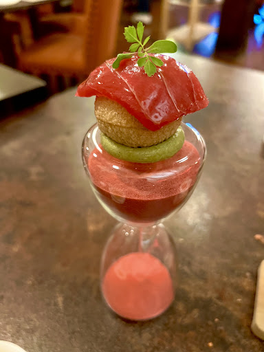 Read moreVous entrez dans cet ancien moulin à paprika, dans le quartier historique d’Espinardo, par une magnifique porte, après avoir sonné. Quelle ambiance en franchissant le seuil ! Le musée se visite, mais attaquons dans le vif du sujet : L’accueil et la présentation de chaque plat sont tout simplement remarquables : merci Pedro ! Tourbillons de saveurs et de textures s’enchaînent à un rythme soutenu alors que vous ne voyez pas le temps passer. Bonbon à base de moules, compotée de carottes aux olives noires, chip de mini crevettes grillées et soubressade explosive au kimchi en guise de snacks voient suivre six entrées : tartares de poisson au café, chocolat et paprika, amandes grillées aux truffes, surprenante anguille fumée sur purée de concombres doux, calamar aux encres, boule de cabillaud poix chiches et épinards, homard et dinde au velouté de jambon ibérique sur lit de blettes. Suivent bar pancetta à la crème de chou-fleur semoule extra fine, magret de pigeon et cuisses fumées aux herbes devant vous, accompagnés d’une duxelle de champignons. J’allais oublier une dégustation particulière, celles des pains : deux morceaux vous sont servis sur un support en pierre compartimenté et vous alors sont présentés un tube composé d’un mélange de deux huiles d’olives (elles-mêmes présentées telles des grands crus), un présentoir avec paprika d’un côté, sel rose de l’autre ainsi qu’une large bougie que l’on allume devant vous. Et bien la bougie se consomme ! Avec un couteau en bois, vous prélevez de ladite bougie dans sa coupelle afin d’en tartiner le pain puis ajouter au choix paprika et/ou sel rose aromatisé. « Pré-dessert » au citron, kumquats et crème glacée sur crumble maison, raviront vos papilles tout autant que les truffes fraîches et chocolats mélangeant saveurs et textures ou le nougat aux popcorns. Des petits fours viendront couronner le tout avec, au choix, un café expresso ou de grande dégustation. Si vous choisissez cette dernière option, vous verrez arriver une desserte, et les différents cafés en grains vous seront présentés ; vous pourrez les humer avant et après mouture. Vous serez alors mis un peu à contribution avec votre cafetière à piston puisqu’il vous faudra, avant d’y appuyer, retourner le sablier ;-) Vous repartirez peut-être avec vos petits pots métalliques Taúlla, plus que rassasié c’est certain : Bravo au chef pour nous emmener dans son univers culinaire et gastronomique, bravo aux équipes en cuisine...