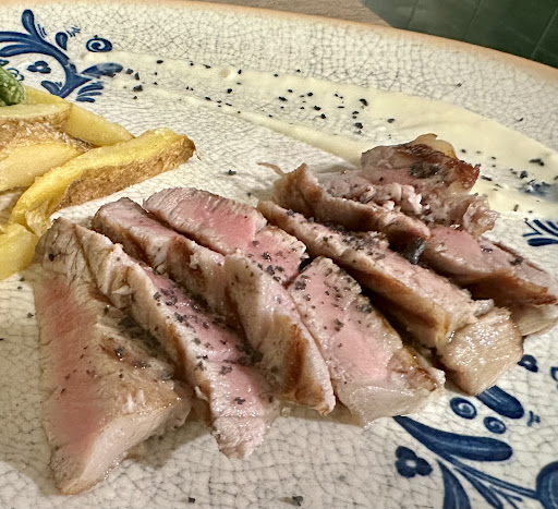 Comida de trabajo. Me llevó un compañero que conocía el sitio. Fui invitado. Mi compañero conocía al lugar (había ido un par de veces) y al dueño o encargado: Juanma. Le cantó los platos sin carta escrita,. Mi compañero le encomendó que nos aconsejara y sacara unos platos para compartir. Pedimos un par de cañas y luego un vino tinto de la casa. Compartimos un postre y nos invitó a una interpretación personal del asiático (prefiero que respeten la receta tradicional).