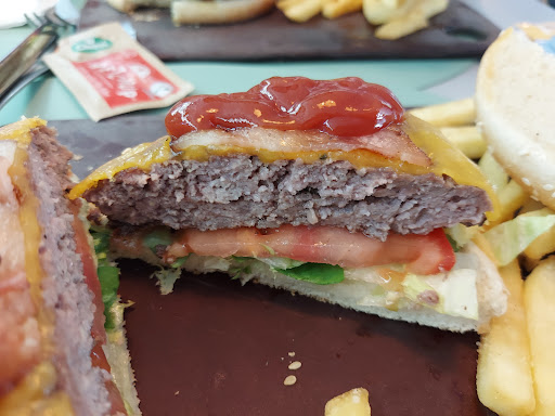 Treinta minutos después, traen la comida de 4 comensales y yo pues me quedo mirando como comen los demás. En mi caso me pedí una hamburguesa de Angus completa, y ya después de 7 minutos me traen una especie de hamburguesa con patatas fritas de bolsa sin sal (se supone que todas las raciones vienen con patatas a lo pobre), un pan de hamburguesa que no estaba tostado, porque se deshizo completamente, un trozo duro de lechuga, pero lo peor es que la hamburguesa no era de Angus!!