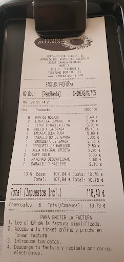 Read moreLa verdad es que no me gusta poner malas reseñas ,más que nada porque no soy nadie para hacer tal cosa ,fuimos 4 personas después de salir de trabajar ,en plan picoteo, el servicio muy atento y servicial ,nos traía las bebidas sin pedirlas ,el embutido y el pan riquísimo ,se notaba casero de los de siempre, por desgracia lo único destacable ,por lo demás , bastante normalito ,ni siquiera los postres ,siendo una venta ,se notaban caseros ,los calamares una pequeña fuente ,algo más grande que las que te ponen con almendras ,olivas ... Para los 4, 19€ algo que deberían de cambiar de carácter urgente y los huevos rotos ,tenían pinta de patatas fritas recalentadas y huevos sin yema ,(de toda la vida la yema debe de cubrir esas patatas a lo pobre ,doraicas buenísimas) por los demás ,croquetas ,caballitos , montaditos, 2 para cada uno ,2 postres al centro ,2 o 3 litros ,4 coke y café (111€) Que cada uno juzgue si es caro o barato, no sé si volveré a ir ,aunque sea para quitarme el mal sabor de boca que me dejó está visita. Espero que se lo tomen como crítica constructiva, espero que no se pierda la esencia de las ventas de...