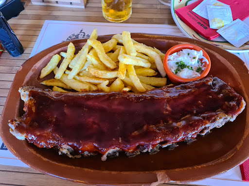 Read moreThe self proclaimed Home of Ribs stands out in Playa de Muro as an American style bar and grill on the main street across from the beach. It is well decorated with modern tables, chairs and classic Americana covers the walls of the restaurant. Think 'TGI Friday's in Majorca' for an idea of the decor and menu ptions available. We ordered pints of beer and frozen cocktails to drink which were freshly prepared and enjoyed by all. A short 15 minutes later we were served our food. Albeit a short wait but considering the food on order it was a reasonable time to wait. 4 orders of ribs, which could be accompanied by 3 sauces, 1 steak and 1 chicken skewer. All dishes came with complementary fries and slaw which helped keep the bill down. The ribs pulled apart from the bone effortlessly and were coated with a great tasting bbq sauce. The only downside was they lacked the flame grilled outer coating i had expected from the images on the menu. Experience has taught us whichever way you like your steak cooked you need to go 1 level higher in Spain. Tonight was no exception and it was served perfectly. The fries were well seasoned and tasted great. Overall a good, reasonably priced meal that satisfied all of...
