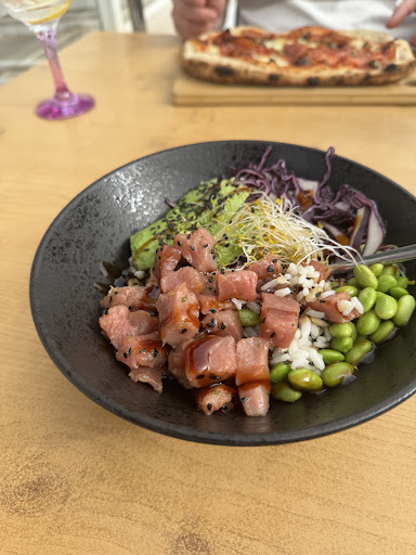 So, why should you still consider going? Well, the lady who served us was kind and eager to assist. If you're looking to grab a drink after a day at the beach and soak in the view, it's definitely worth a visit. Plus, if you're craving a good pizza or poke bowl, you're in luck because they were actually quite delicious. Although, I must admit, the Poke Bowl lacked a bit in flavor.