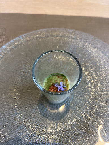 Amuse-bouche: Lauch-Shot mit einem Crunch, war gut