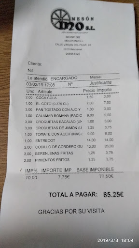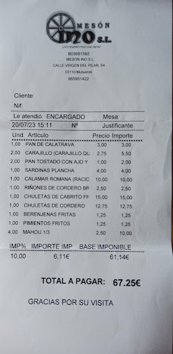 Cuando ya estuvimos todos y empezamos a pedir los platos, los entrantes tardaron mucho de uno a otro, los calamares, de los cuales soy adicto, he de decir, pedimos una ración (cuesta 16€) y nos la cobraron a 21€ (pagados a regañadientes). Unos calamares finitos (como ya vi a posteriori en alguna reseña) y de lo más insulsos, y al comentárselo al camarero, nos dijo que era porque nos pusieron un poco más ya que la ración es para 4 y éramos 6. Si me vas a poner más me lo dices, no me lo cuelas en la cuenta, que a saber si pusieron realmente más. También nos metieron en la cuenta una Coca Cola de más y un agua grande.