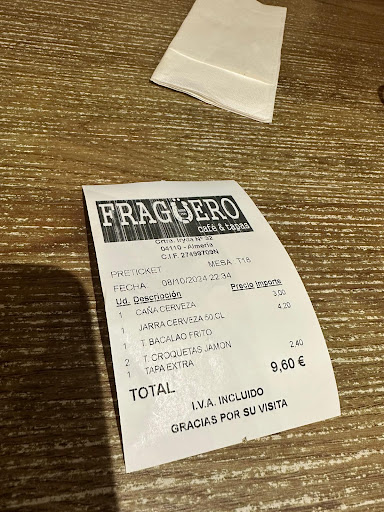 Read moreEs la segunda vez que vengo y la última. Ponen tapas de gulas y gambas, pero sin gambas, las reclamo y me dicen que la tapa es gulas solamente, pero en el menú dice otra cosa. Por este motivo ya el trato se volvió desagradable al reclamar yo que lo indicado en la carta no es lo que entregan. Me indican que no se puede fumar de muy mala manera, yo me senté en la terraza y no presté atención a los carteles de prohibicion. Reclamo una tapa de buñuelos que ellos dicen haber entregado en mi mesa, pero no es así. El camarero dice no enter mi forma de hablar, siendo que hay argentinos trabajando en este restaurante, la verdad nunca me trataron así en un sitio....