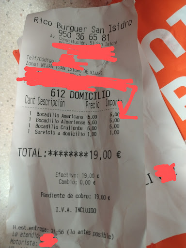 Read moreDespués de un tiempo(pedí una pizza y después de una hora, más fría que una llave en Trevélez) , les he dado una oportunidad, pero ha sido peor. Pedido de 3 bocatas a las 21:10 y me llaman a las 22:10 diciendo que han estado en mi domicilio y no funcionaba el portero y se ha dado la vuelta el repartidor, porque no llevaba el móvil... A las 22:30 llega otro repartidor(ahora sí funciona el portero) y dice que tiene muchos pedidos, le expongo mis quejas y me dice que si no quiero que no los pague, Le digo que los pago(19€) por supuesto y será la última. RESUMEN: El pedido tardó más que el AVE Almería-Murcia y los bocatas más fríos que mis cojones de maniobras en el pirineo hace 30 años! Mejor les pido un Kebab a mis vecinos Pakistanies y les dejo propina. Es...