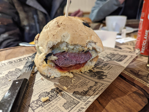 Read moreFuimos a comer cuatro personas después del día en las pistas. Pedimos recomendación al dueño del local sobre qué comer. Nos recomendó la paella (para dos) y las costillas, además de las hamburguesas. La hamburguesa capricho (18€) estaba deliciosa. La de setas (13€) muy rica tambén. La de queso azul (13€) muy normalita. De tamaño, alguien de buen comer considerará que son escasas de tamaño y se va a quedar con bastante hambre. Las costillas (18€), muy ricas también, aunque de nuevo, justita la ración (cinco costillas no muy grandes). La paella, normal, pero nos dijo que era para dos y la ración era un plato muy escaso (en mi ciudad eso es una ración individual) y nos la cobró a 40€. Una vergüenza. Si no llega a ser por lo que nos cobró por la paella, habría sido un sitio tirando a caro, pero con buena comida; pero es que además el dueño del bar nos despidió diciéndonos que gracias por la propina (con bastante sorna), mientras se reía con sus amigos del viaje a Tailandia que se iba a pegar unos días después. Muy cortante y seco, además de con un aire altanero que llegaba a prepotente. Y bastante borde con alguno de los otros...