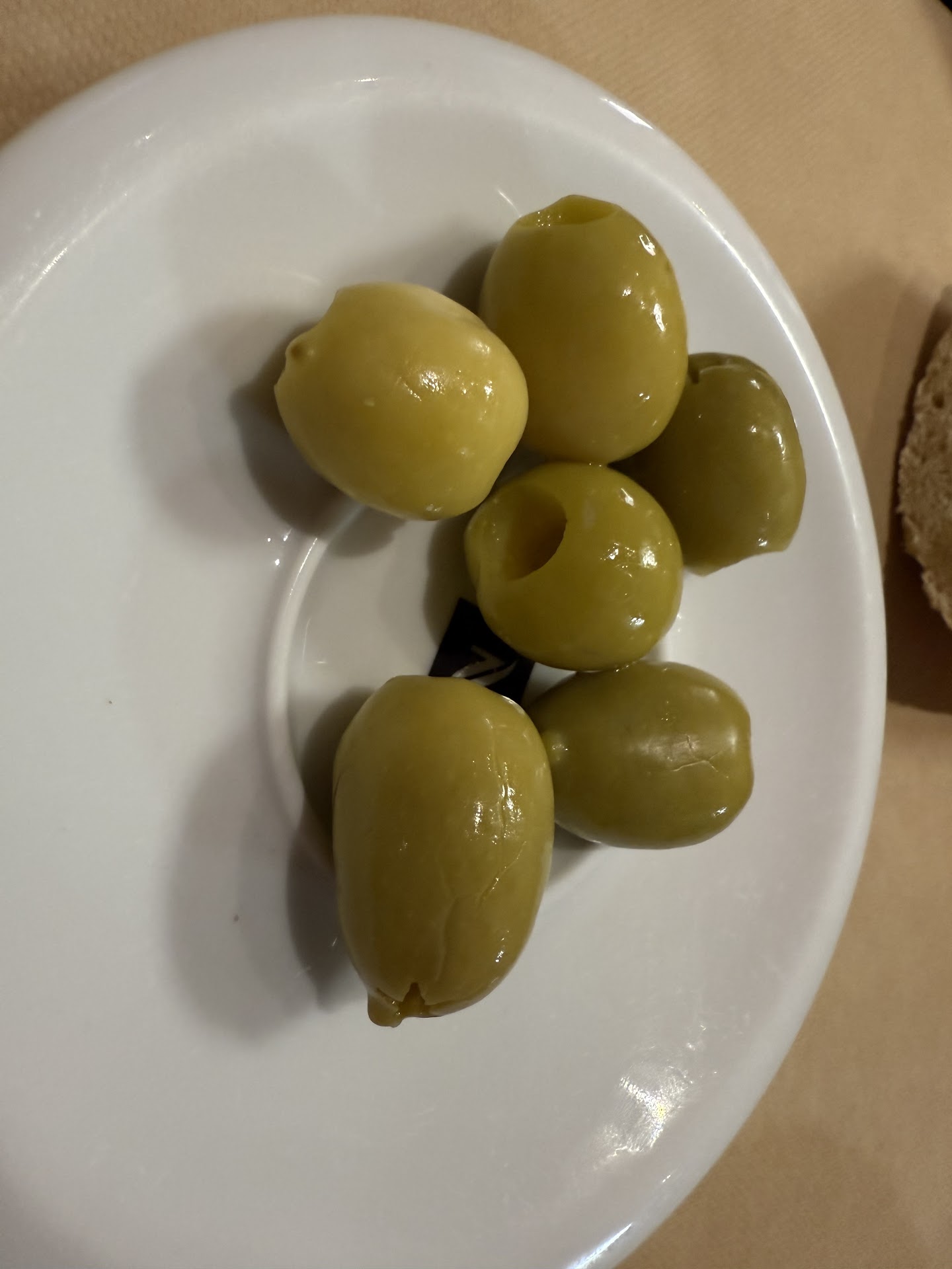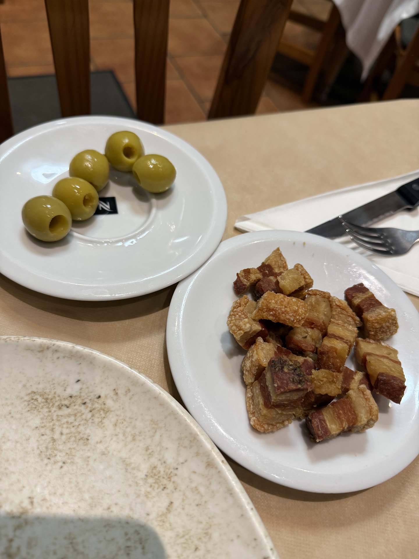 Nada más sentarnos en la mesa, nos pusieron dos trocitos de pan blanco, que estaba muy rico, unas aceitunas y unos cuantos torreznos muy crujientes y sabrosos.