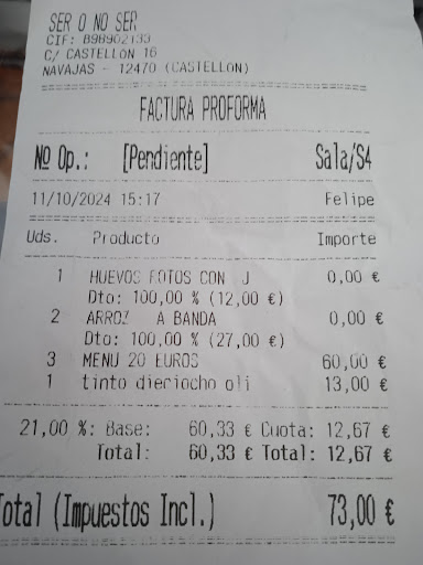 Read moreUn festín para los sentidos donde la atención y la calidad brillan con luz propia. Mi reciente visita al Ser o no Ser fue una experiencia gastronómica memorable, donde tres pilares fundamentales se alzaron para conquistar mi paladar y mi satisfacción. En primer lugar, el servicio de los camareros fue sencillamente impecable. Desde el momento en que crucé el umbral, fui recibido con una calidez genuina y una profesionalidad exquisita. Su atención fue constante pero discreta, siempre atentos a cualquier necesidad sin resultar intrusivos. Sus recomendaciones fueron acertadas y su conocimiento de la carta demostró una dedicación que se agradece enormemente. En segundo lugar, el surtido de croquetas merece una mención aparte. Cada una de las variedades ofrecidas era una pequeña obra de arte culinaria. Desde las clásicas y cremosas hasta las más innovadoras y sorprendentes, la textura crujiente por fuera y melosa por dentro era simplemente perfecta. La diversidad de sabores, desde el jamón ibérico hasta el bacalao o los boletus, deleitó mi paladar y me invitó a probar cada una de ellas. Sin duda, un imprescindible para cualquier amante de este manjar tradicional. Finalmente, la variedad de las carnes fue otro de los puntos fuertes de este establecimiento. La carta ofrecía una selección tentadora que abarcaba desde cortes clásicos hasta propuestas más elaboradas. La calidad de la materia prima era evidente en cada bocado, y la preparación, cuidada al detalle, realzaba el sabor y la jugosidad de cada pieza. Ya sea que se prefiera una carne a la brasa con su toque ahumado, un guiso tradicional lleno de sabor o un corte más sofisticado, la oferta satisfará sin duda a los paladares más exigentes. En resumen, el Ser o no Ser ofrece una experiencia gastronómica completa donde la excelencia en el servicio, la deliciosa variedad de croquetas y la calidad de sus carnes se combinan para crear un momento verdaderamente placentero. ¡Sin duda, un lugar al que volveré y que recomiendo...