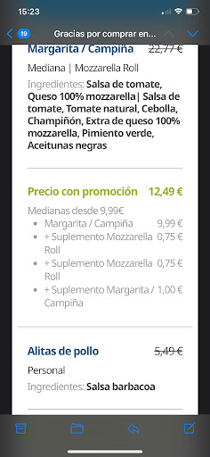 En definitiva: una falta de profesionalidad por parte del repartidor por no saber buscar una calle, una falta también de saber proceder por parte de la encargada de tienda que prefiere tener una hoja de reclamaciones a regalar un pedido de 24 euros o regalar en el pedido nuevo unas malditas alitas de pollo... Encima alegando cosas falsas en vez de pedir perdón y asumir responsabilidades y mala actuación por parte del establecimiento.