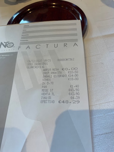 Read morePrimer día del puente de diciembre. Por las reseñas se trata de un restaurante con platos de caza...tan sólo les quedaba jabalí y cabrito, -si es que a este último lo han cazado-. De entrante una crep de amanita cesárea, que no estaba mal. Como plato principal pedimos jabali y cabrito frito. Del jabalí te sacan cuatro trozos y como guarnición simplemente cuatro minizanahorias. Al cortar la primera percibo que está helada, cosa que sucedió también con una pareja que se encontraba a nuestro lado. Devuelvo el plato y lo calientan. La verdad es que el jabalí estaba bueno, pero adjunto foto -sin la zanahoria helada- para que se pueda ver la cantidad....ridícula. Del cabrito frito -trozos de chuleta y pierna-, mejor no hablar. Ante su desagradable sabor, llamamos a la camarera para decirle que aquello no estaba en condiciones de servirse. Lo que me dejó perplejo es que no se sorprendió, limitándose a retirarlo y ofrecernos otro plato de la carta, sugerencia que rechazamos. No puede servirse un plato en esas condiciones. Pedimos la cuenta y nos fuimos sin tomar siquiera café. Lo mejor un excelente Atalayas del Golbán. P. D. Está prohibido por ley no incluir el IVA...