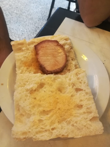Read moreEntramos porque he pasado por allí durante años y parecía tener buena pinta, muchas fotos y menciones a jamón en la puerta y por las paredes... 😕 Le pedimos expresamente tostada de aceite y jamón y nos lo ponen con tomate, supuestamente porque todas sus tostadas vienen con tomate, pero expresamente pedimos "de aceite y jamón", ojo con eso. Al final, accedió a cambiarlas. Y el jamón, si no lo pides ibérico te lo ponen deshuesado, del DIA, como digo yo. Preguntamos si eran rebanadas y nos dijo que sí, rebanadas; tampoco era cierto, porque resulta que eran pedazos de una barra de pan con su parte de arriba y su parte de abajo (eso no es una rebanada). Pan de barra, el que ha desayunado alguna vez en Sevilla sabe que esto es "tarjeta amarilla" para el bar en cuestión. Poco aceite y por supuesto nada de virgen (ya no te digo ni que sea extra). Jamón y pan insípidos.... Con el café sí acertó con la temperatura, la leche muy caliente, porque el concepto de "muy caliente" por estas latitudes es distinto que por el sur. Todo por el "módico" precio de 16'70€ tres tostadas (insípidas) y dos cafés. No...