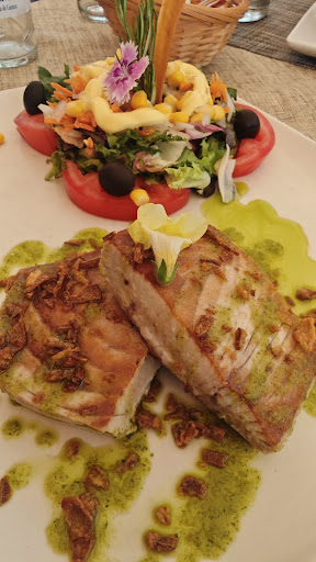 Nuestra comanda consistió en: Langostinos al pil pil.- Deberían cambiar el nombre del plato, por más que pienso, sigo sin encontrar el pilpil. Realmente son unos langostinos al ajillo, con su guindilla y con la diferencia de que a estos le añaden un poco de pimentón. A ver, por 10€, a lo mejor no se puede pedir más, pero lo cierto es que ese precio me parece caro si me encuentro una docena de langostinos en una cazuela metálica (hirviendo - lo cual deberían avisar porque si se te ocurre tocarla, la quemadura no sería algo leve) en la que mientras se enfría, se están friendo, así que para cuando se ha enfriado un poco y te los puedes llevar a la boca, te encuentras unos langostinos secos y endurecido, y lo del "pil pil" no aporta gran chispa al sabor, la verdad, porque hay que ir rebañando y buscando los ajos y el pimentón para saborear alguna gracia, lo cual me hace recordar que el aceite (no dudo que no fuera de oliva) no tenía ese particular sabor del aceite de oliva V.E. impregnado del sabor de los ajos. Vaya, nada recomendable este plato. Luego pedimos: Salmón a la plancha con ensalada.- Un plato también "incomprensible" porque tampoco se entiende la intención del cocinero/a de decorar las esquinas del plato con: 1 rodaja de calamar frito con flores (no sé si comestibles), en otra esquina había un recorte de alga nori (de las de sushi) y sobre esto, unos cherry en rama (sin lavar, por cierto) y en el centro del plato, un lomo de salmón (algo pasado de cocción) que imagino se hizo a la plancha y para emplatar, lo bañaron en el mismo "mejunje" de los langostinos, aceite con pimentón y ajos, ah! y coronando el lomo de salmón, otra flor, en este caso, un clavel (creo que no son comestibles) lo cual no deja de ser un sinsentido. Pero en fin... Las 3 estrellas se las doy, porque, después de estos dos platos, en los que había más adornos que comida, obviamente, nos quedamos con hambre, así que mirando las pizarras publicitarias de la fachada, decidimos pedir una de carne a la piedra. Nos decidimos por ternera, aunque disponen de más carnes (solomillo y chuletas de cerdo, entrecot, etc) el caso, es que recibimos en mesa, una bandeja con piedra calentada al horno a 360° y sobre esta, un medallón de solomillo de ternera, que nosotros cortamos y marcamos a nuestro gusto de punto, he de decir que la carne era como mantequilla, tanto en textura, como en sabor, espectacular, la verdad. De hecho, en vez de mirar la carta al llegar, debimos mirar las pizarras de la fachada, porque creo que los cortes de carne, es en el apartado en el que este sitio despunta. Así que en definitiva, si vas a parar en este lugar, y te gusta la carne sin florituras, no te lo pienses. El resto de la carta, creo que deben revisarlo con cocina para que afinen las propuestas. Por cierto, en verano, mejor reserva, porque solo sirven comida en terraza y esta no es muy grande y un detalle más a tener en cuenta, las comandas tardan en llegar, lo cual no se entiende, porque hay tres camareros y no hay tantas mesas como para...