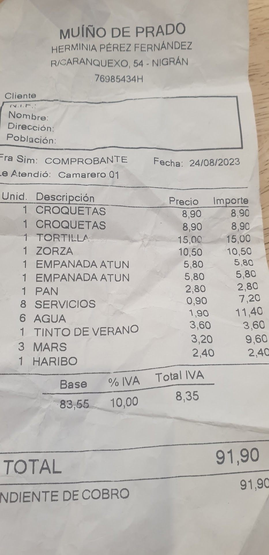 Read moreEntró al 14h24 para comer con mi hija y mi marido. Ya que había muchas mesas vacía . Y al final me dicen para comer solo hay para uno. Así que bueno me quedo porque tenia que hace comer por la meno mi hija . Le pido 1 empanada de atún , patas fritas, pimiento de padrón. I cerveza y una de agua. Y mi marido como no podía comer tenía que pedir a la barra a la mesa no se podía. Bueno me trajeron de comer a la15h45 mi hija dormía ya … una gana de irme … y repito la mesa era a más que la mita vacía. Y siguieron así hasta que nos fuimos. Un falta de comunicación… y el tempo exagerado para lo que pedimos. No hay...