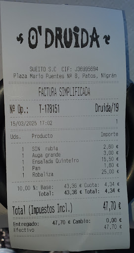 Quisiera compartir una experiencia que me pasò en la fecha de un sábado tal como el 8/4/2017, en el restaurante " O druida" , q se encuentra en Patos, si se puede llamar restaurante.........reservamos comida dentro del mismo, cuando llegamos nos dicen q tienen q ponernos fuera ya que una señora dice q como no se encuentra bien, la ponen dentro, ( claro está, enfrente de la playa siempre hace aire) , yo le indico al camarero amablemente, q en mi caso debido a cierto problema, mi familia tampoco puede estar en medio de corrientes, con lo cual estamos desde las 15:15h hasta las 15:40 esperando y como es un día festivo no tenemos prisa, nos sentamos, hacemos pedido enseguida ya q lo teníamos logicamente todo pensado, a partir de ahí, esperamos para el primer plato, un pollo a la plancha para una de mis hijas, casi una hora sobre las 16:15, ohhh sorpresa!!!!por fin mi hija mayor empieza a comer sola y los demás mientras tanto sin comer nada, cuando a la hora nos traen pan , jocoso el tema!!!!Viendo q mi hija la pequeña comía pan sin cesar, me levanto y le indico amablemente q pasa????q mi hija pidiò simplemente una milanesa y no nos traen la comida, contestan q ahora mismo, esperando, ......llegan las 16:30 de la tarde y ni caso x su parte, cuando a las 16:40h, vemos a un camarero y le indicamos q nos traiga la cuenta, pues aún así, no nos trae la misma, con lo q nos levantamos y vamos a la barra diciendo q queríamos pagar lo q nos habían servido en una hora y media , q eran. 2 vasos de vino, una botella de agua, y un plato de pollo a la plancha, pues para más inri,nos hacen pagar una nota por lo que pedimos ,masssssss lo que no comimos, con lo q el calentamiento va increchendo, le trasladamos nuestro desacuerdo, decepción, y falta de respeto y educación hacia el cliente ya q ni siquiera pidieron disculpas??simplemente un sigilosa voz diciendo " es que no damos a basto".......Por lo tanto la valoración de este -antro- es pėsima en servicio y por lo visto lo único q les interesa a esta PEOPLE esssss hacer CAJA.!!!!!!!.......No interesa el cliente, y tienen q darse cuenta q sin los clientes NO SON NADA....... Y lo más importante es q han dado con gente demasiado educada q han pagado la cuenta y han dado su desacuerdo educadamente , si somos otros nos levantamos nos vamos y no pagamos , o sea un desatino total...........Por cierto un olor horroso en el local, sales con la ropa para llegar a casa y meterla en la lavadora.........No vayan a este restaurante, hay otros alrededor con más, aunque sólo sea ,talante.........como pueden entender se han REIDO, DEL CLIENTE......y sobre todo su jefe , al cual le estoy dando mi desacuerdo diciendole q puede transmitirle la reclamación a su jefe, y resulta q salgo de allí y me entero que a quién se lo dije es a él y no ha tenido ni la decencia y ni la hombría de dar la cara.....por cierto hablando ya con gente q le conocen dicen de este señor q es poco FIABLE.......y parece ser por otras reseñas q a este señor le va la chunga y sobre todo con las familias y con niños.....Ya le vale, no sé como le puede seguir con este negocio,...