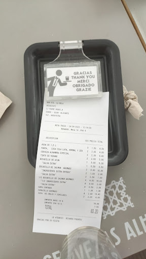 Wonderful views from the terraces, you can see La Mola on the interior terrace, and on the exterior you can see all valley and the Vinalopo river. Great attention from the waiter, and delicious food. Generous portions and quality homemade food. 3 variations on the first course and another 3 on the second. Menu for €12, but does not include dessert or coffee, but does include salad and a drink. For dessert the supplement is €1.5 and for coffee it is €1 more.