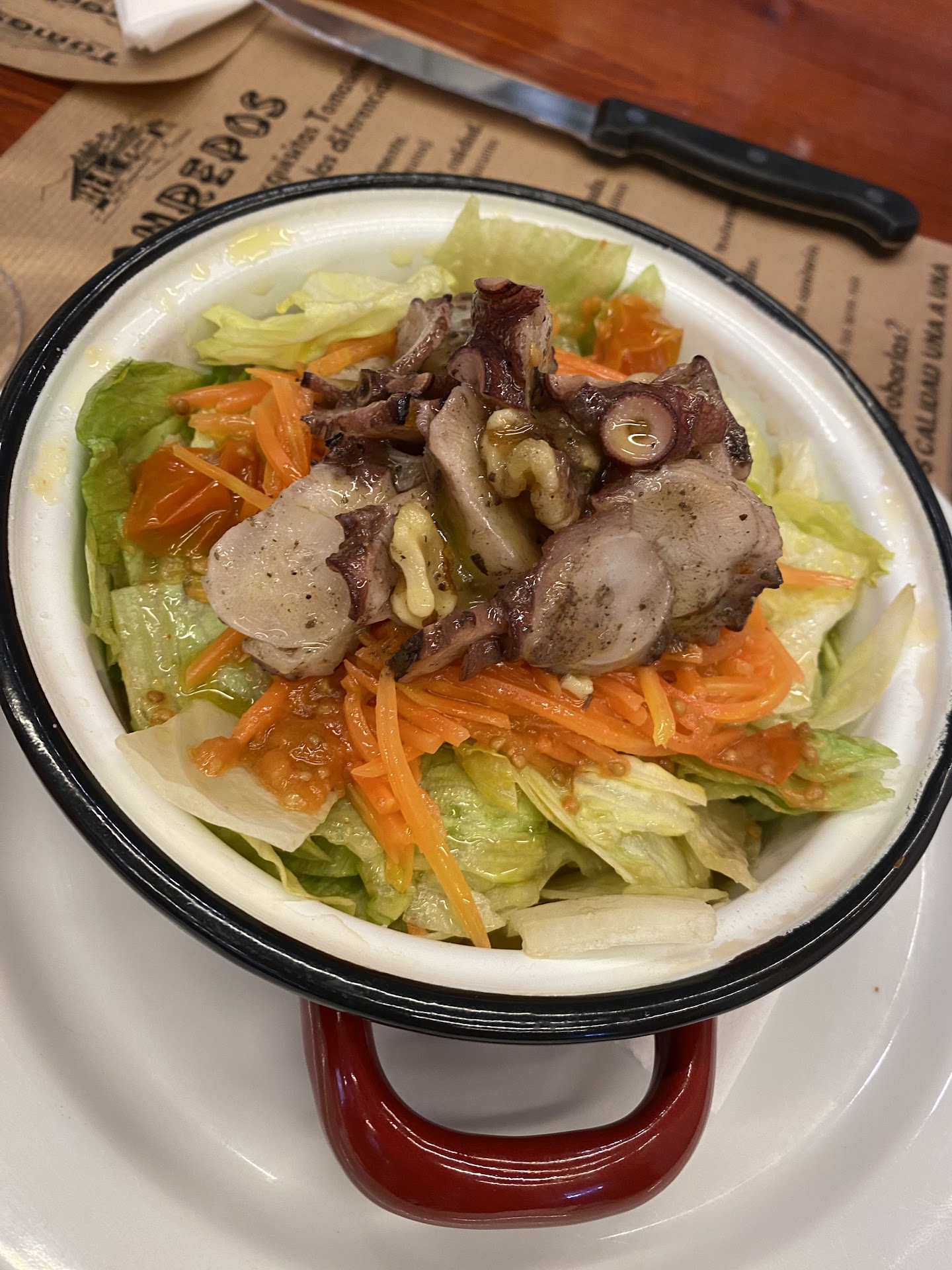 Íbamos de paso, pretendíamos comer rápido algunas tapas de mostrador ya hechas en la barra, o como mucho un bocadillo. La empleada que estaba en la parte de la cafetería nos dijo que íbamos a perder menos tiempo si nos sentábamos en la zona del comedor... 1 hora y media para despachar un menú sin gracia, un caldo que abrasaba, un principal de tacos de ternera en salsa soso a más no poder en lugar de la carrillera que anunciaba el menú; y una encargada desagradable y con muy pocas ganas de agradar a los forasteros. Ejemplo: había una mesa libre cuando llegamos. Para pasarle un trapo, porque no tenía ya nada encima que retirar, nos tuvo esperando cerca de 5 minutos, ya que entre unas cosas y otras, se tuvo que poner a charlar tranquilamente con una familia de otra mesa que debían ser conocidos, vecinos o familia. Con los amigos no se charla si tienes a clientes esperando a que los sientes. Charlas una vez que los has sentado. Lo único bueno del sitio, la longaniza y las "Tomasinas", unas madalenas rellenas que deben ser un invento de la familia. P.D. Los aseos no tenían jabón. Se veía que hacía años que no rellenaban el dispensador. Más cómodo poner un bote de gel hidroalcohólico... No tienen ni idea de lo que es lavarse las manos, eso no lo sustituye frotarse con gel hidroalcohólico. En fin, para señalarlo en el mapa......